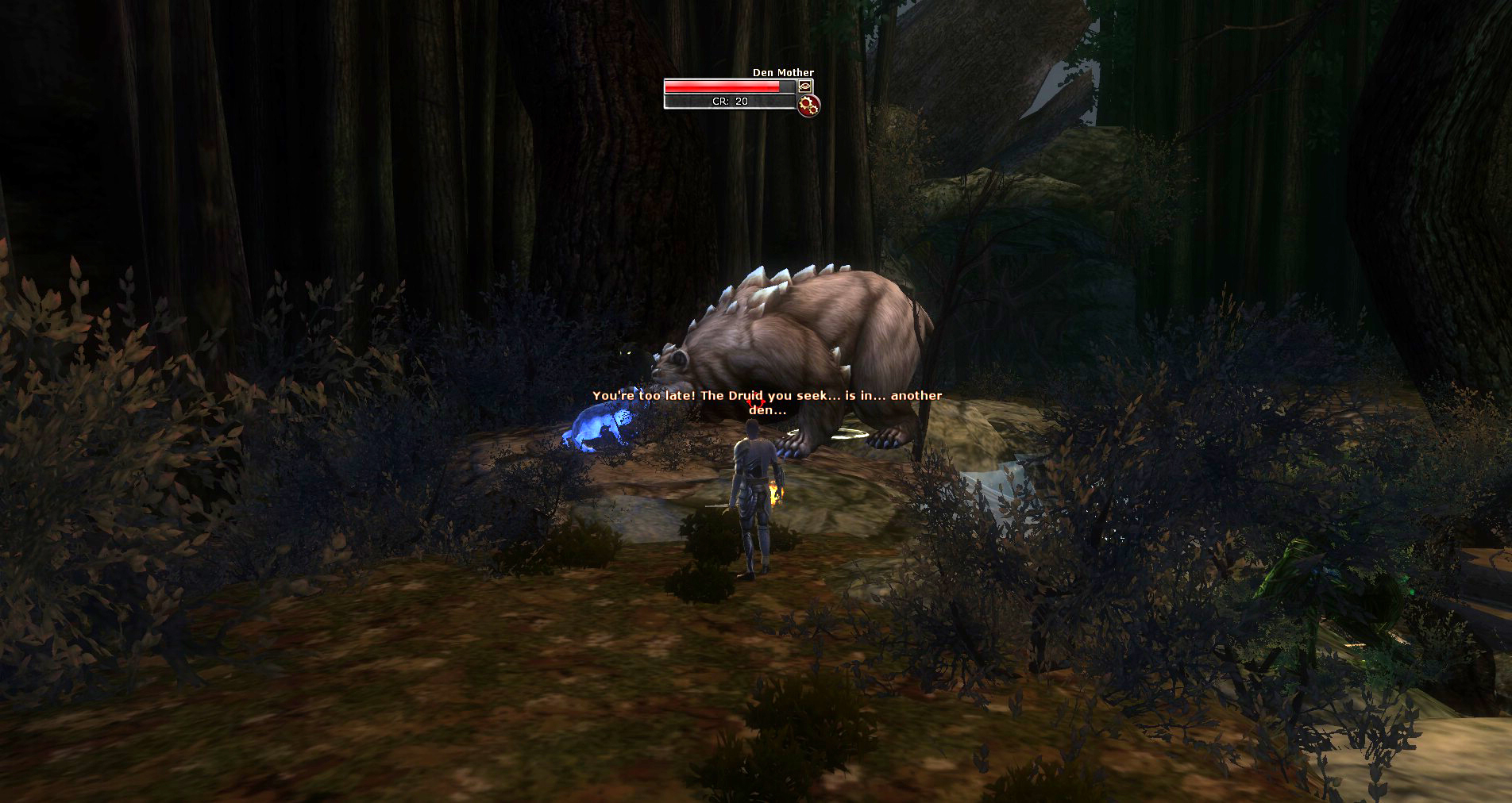 In the glade to the north of the central area is the last druid, Flinbeck. He is can be nasty himself but he also has a named dire bear called Den Mother. Watch out she is mean. Make sure to take out the corrupted druid first but the Den Mother should be a close second. If you can pull the Den Mother off to the side away from everyone else then take out Flinbeck. Once he is dead then kill the Den Mother. Then all you need to do is a little cleanup of anything else that is left.